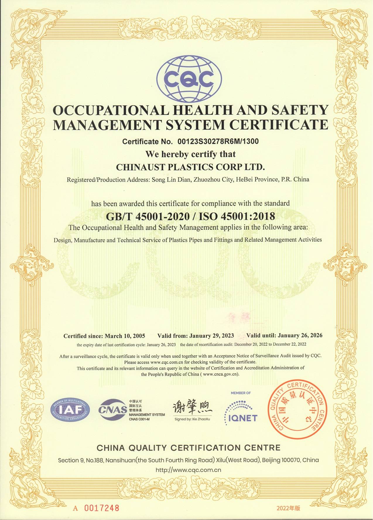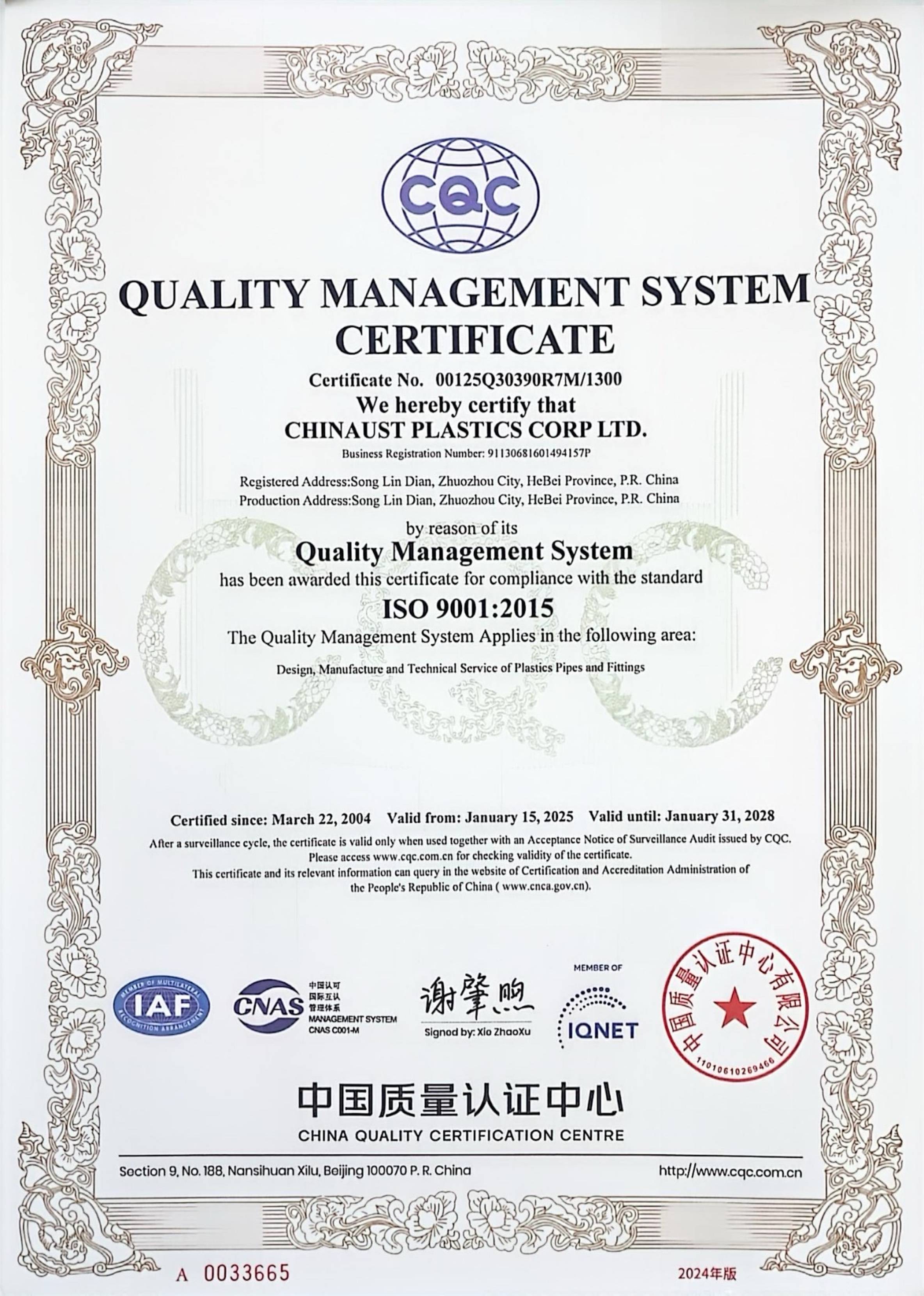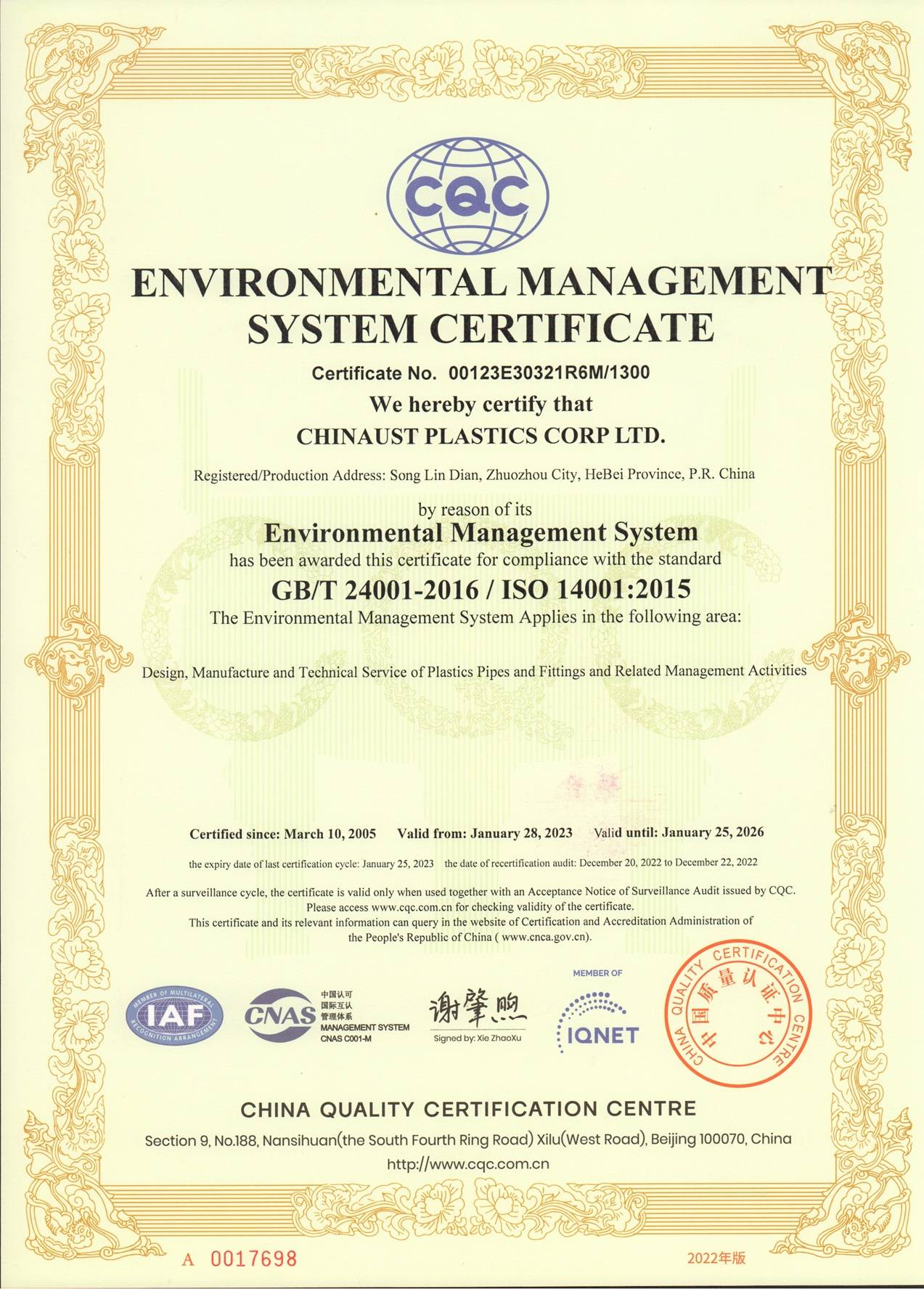 A Chinaust Plastics Co., Ltd. foi fundada em 1987, sendo a primeira joint venture sino-estrangeira na China especializada na produção de sistemas de tubulações de polietileno (PE). O acionista chinês é a Ling Yun Industrial Corporation Limited, empresa listada subordinada ao Northern Lingyun Industry Group Co., Ltd., que pertence à China Ordnance Industry Group Co., Ltd.. O acionista estrangeiro é a Georg Fischer AG, multinacional suíça com mais de 200 anos de história.