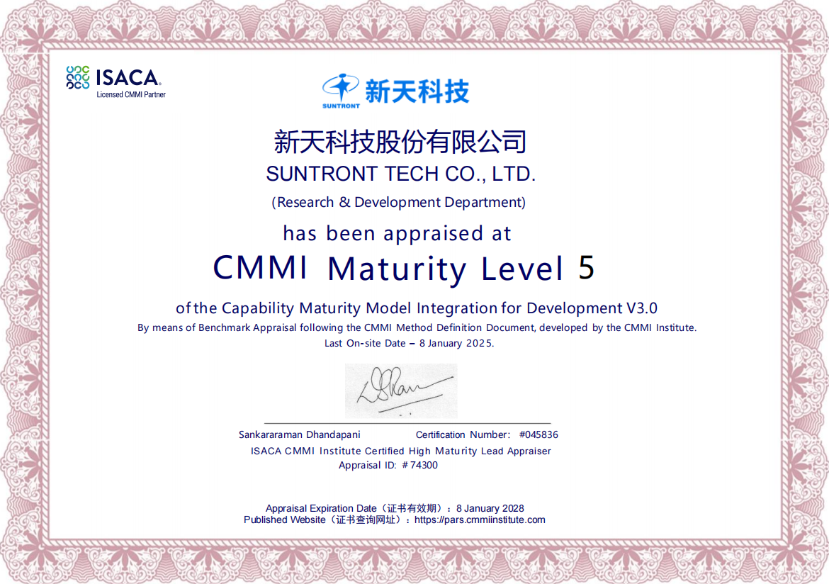 A Suntront Technology obteve certificações completas dos sistemas de gestão relacionados ao ISO e recebeu diversas distinções, como “Empresa Nacional Modelo em Inovação Tecnológica”, “Top 100 Empresas de IoT da China” e “Melhor Empresa Listada no ChiNext”. A empresa também apareceu várias vezes na lista “Top 100 Empresas Listadas Mais Promissoras da Forbes China”. O centro de P&D da Suntront foi reconhecido como “Centro Nacional de Tecnologia Empresarial” e “Centro de Pesquisa em Engenharia de Instrumentos de Medição Inteligentes”, conquistou a certificação internacional CMMI nível 5 — o mais alto grau de maturidade em desenvolvimento de software —, a certificação do laboratório nacional CNAS, e foi aprovado para estabelecer uma “Estação de Pesquisa Pós-Doutorado”. Atualmente, a empresa possui mais de 1.000 patentes nacionais e direitos autorais de software. A fábrica inteligente 5G da Suntront tornou-se um modelo de aplicação da plataforma nacional de “dupla inovação” em manufatura inteligente, recebendo alto reconhecimento de líderes nacionais, provinciais e municipais.