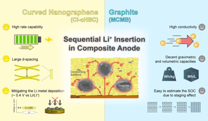 A equipe, composta pelo professor Seok Ju Kang da Universidade Nacional de Ciência e Tecnologia de Ulsan, pelo professor Sang Kyu Kwak da Universidade de Corea e pelo Dr. Seokhoon Ahn do Instituto Coreano de Ciência e Tecnologia, desenvolveu um ânodo híbrido composto de grafite e materiais orgânicos nanoestruturados (folhas nanométricas de cloro-torcidas de hexa-fenil-bencocoro). O material cria espaços intercamada e canais nanométricos formados por folhas curvas, guiando a inserção dos íons de lítio em etapas: os íons entram primeiro nas folhas nanométricas e, em seguida, se incorporam ordenadamente às partículas de grafite, evitando a formação irreversível de "lítio morto" na superfície. Dados experimentais mostram que, sob condições de carregamento rápido de 4A/g, a capacidade do ânodo híbrido supera quatro vezes a do grafite tradicional; em testes de bateria completa, as células pouch combinadas com cátodo NCM811 mantêm 99% de eficiência coulombiana após 2.100 ciclos e 70% da capacidade após 1.000 ciclos.