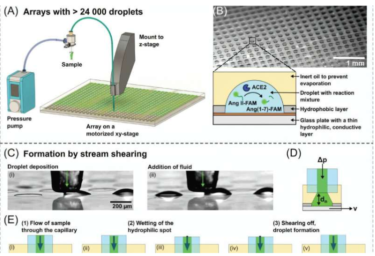 Uma equipe de pesquisa do Instituto Federal de Tecnologia de Zurique desenvolveu uma nova tecnologia de matriz de microgotas capaz de gerar até 100 mil microgotas em apenas 40 minutos, aumentando significativamente a eficiência das análises de atividade enzimática. Essa inovação oferece uma nova abordagem para triagem de alto rendimento em processos de desenvolvimento de fármacos. A tecnologia baseia-se no método MASS (Microdroplet Array by Shear Stress) e em suas aplicações.