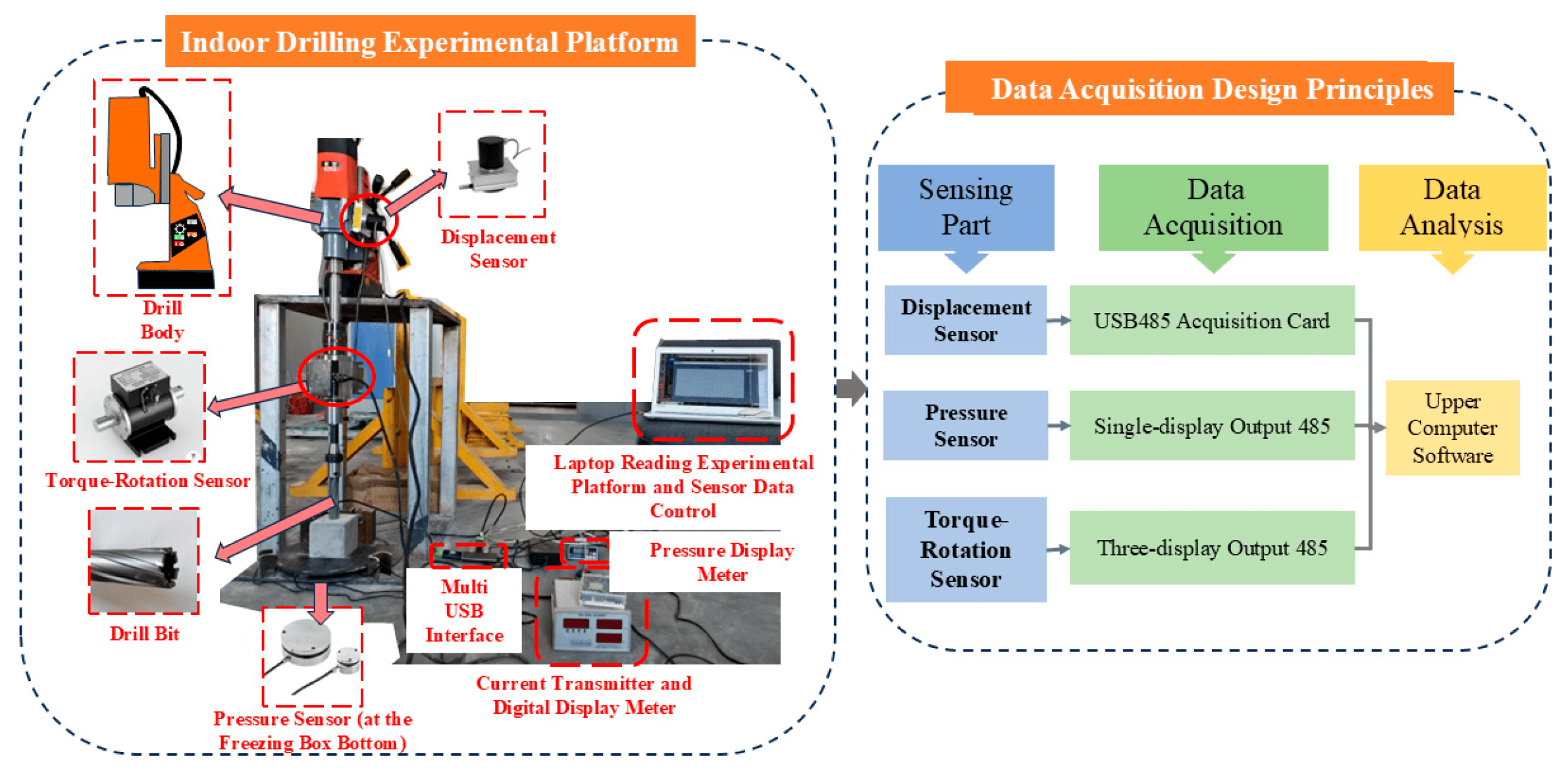 Para estudar com precisão o mecanismo de influência do ambiente de congelamento nos parâmetros de operação da sonda, a equipe de pesquisa construiu de forma independente uma plataforma experimental de perfuração digital em laboratório, capaz de simular condições de temperatura ambiente (normal) e estado de congelamento (-20°C), realizando experimentos de perfuração comparativos repetidos em mais de cinco tipos de materiais semelhantes a rochas com diferentes resistências. A plataforma monitorou em tempo real respostas de múltiplos parâmetros, como torque de perfuração, força de avanço da broca, rotação da broca e velocidade de perfuração. Os resultados experimentais revelaram uma regularidade chave: em um ambiente congelado a -20°C, a interação gelo-rocha causa flutuações de alta frequência severas e deriva não linear no sinal, manifestando-se especificamente como aumento significativo no torque da broca e na força de avanço, enquanto o valor da rotação estável diminui.