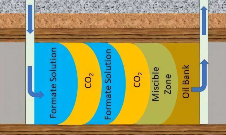 A equipe de pesquisa da Universidade do Texas em Austin desenvolveu uma nova tecnologia de portador de carbono que converte dióxido de carbono em formiatos, aumentando a recuperação de petróleo ao mesmo tempo em que realiza um sequestro de carbono mais eficiente. Um diagrama do estudo ilustra o processo de aumento da recuperação de petróleo utilizando soluções de formiato e deslocamento por CO₂ em blocos. A solução de formiato foi proposta pelos pesquisadores da Universidade do Texas em Austin como um portador de carbono alternativo. Em estudos de simulação, essa solução superou os métodos tra