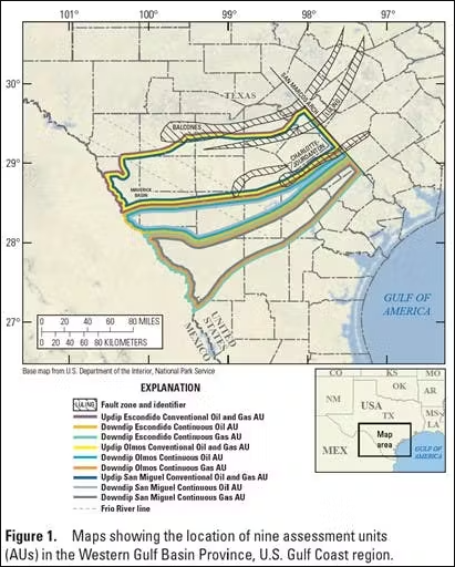 A avaliação abrange a bacia de Maverick no sudoeste do Texas e áreas vizinhas. O USGS conduziu uma análise detalhada de nove unidades de avaliação na bacia, que incluem as formações de Escondido, Olmos e San Miguel na planície costeira sudoeste do Texas, englobando reservatórios convencionais e contínuos de petróleo e gás.