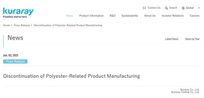 Em 3 de junho, a Kuraray Co., Ltd. anunciou a decisão de encerrar a produção de resina de poliéster e filamentos de poliéster em sua subsidiária de manufatura, Kuraray Saijo Co., Ltd. (localizada na cidade de Saijo, província de Ehime; Fábrica de Saijo da Kuraray).