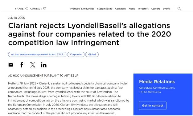 A Clariant anunciou que, em 16 de julho de 2025, recebeu uma solicitação de ação judicial por danos apresentada pela LyondellBasell ao tribunal de Amsterdã, nos Países Baixos, contra quatro empresas, incluindo a própria Clariant.