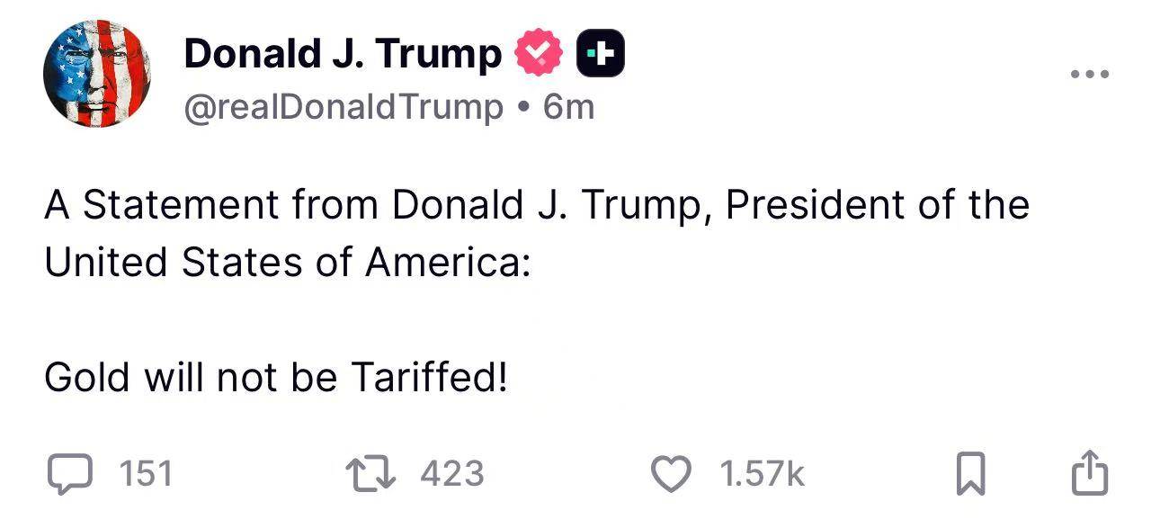 No dia 11 de agosto, à tarde, o presidente dos Estados Unidos, Donald Trump, publicou em suas redes sociais que não serão aplicadas tarifas sobre o ouro.