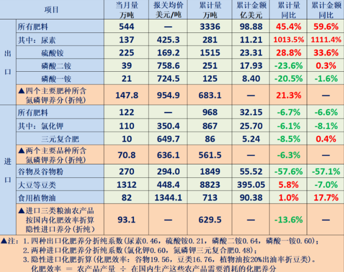 De acordo com estatísticas da Alfândega da China, de janeiro a setembro de 2025, a China exportou acumuladamente 33,36 milhões de toneladas de diversos fertilizantes, com crescimento anual de 45,4%; o valor acumulado das exportações foi de 9,888 bilhões de dólares americanos, aumento de 59,6% em relação ao ano anterior. Entre eles, a exportação acumulada de ureia foi de 2,81 milhões de toneladas, aumento de 1.013,5% ano a ano; sulfato de amônio, 15,15 milhões de toneladas, aumento de 28,8%; fosfato diamônico, 2,51 milhões de toneladas, redução de 23,6%; fosfato monoamônico, 1,25 milhões de toneladas, redução de 20,5%.