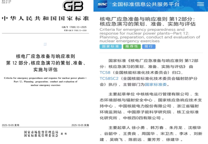 Recentemente, a Administração Estatal de Regulação do Mercado lançou oficialmente a norma nacional GB/T 17680.12-2025, "Diretrizes de Preparação e Resposta a Emergências em Usinas Nucleares, Parte 12: Planejamento, Preparação, Implementação e Avaliação de Simulações de Emergência Nuclear". Como editora principal desta norma, a Qinshan Nuclear Power, com mais de três décadas de experiência prática e conhecimento técnico, contribuiu mais uma vez para o desenvolvimento do sistema de padronização de energia nuclear do meu país. Isso marca uma nova etapa na padronização e sistematização da gestão de simulações de emergência nuclear no meu país.