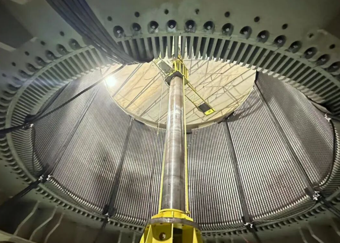 O teste de magnetização do núcleo do estator é um componente essencial dos testes elétricos em larga escala para geradores e é crucial para garantir a operação segura e estável da unidade a longo prazo. O teste verifica de forma abrangente a qualidade da laminação do núcleo e o isolamento interlaminar, medindo parâmetros-chave como a perda de massa do núcleo e monitorando o aumento de temperatura do garfo e dos dentes. O núcleo do estator da Unidade 4 utilizado neste teste é maciço, com um diâmetro interno de 5 metros e uma altura de 3,5 metros. Ele é montado com precisão a partir de mais de 120.000 chapas de aço silício de alto desempenho, cada uma com apenas 0,5 mm de espessura. A cilindricidade geral é controlada dentro de 0,21 mm e a circularidade geral não excede 1,5 mm.