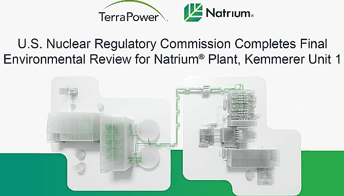 A Comissão Reguladora Nuclear dos EUA (NRC) concluiu com sucesso a avaliação de impacto ambiental (AIA) do projeto Natrium da TerraPower e recomendou formalmente a emissão de uma licença de construção para a usina nuclear Unidade 1 de Kemmerer, no Condado de Lincoln, Wyoming. A TerraPower já havia submetido um pedido de licença aos órgãos reguladores dos EUA e planeja iniciar a construção da unidade em março de 2024. O projeto Natrium, a primeira parceria público-privada desenvolvida no âmbito do Programa de Demonstração de Reatores Avançados (ARDP) do Departamento de Energia dos EUA, atraiu atenção significativa.