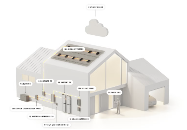 O sistema inclui a bateria de armazenamento de energia IQ Battery 5P com um microinversor conectado à rede integrado, o microinversor da série IQ8 com capacidade de partida rápida solar e um alternador de reserva de terceiros. Esses componentes trabalham em conjunto para atender à demanda de energia de forma eficiente e carregar a bateria. Seu software inteligente otimiza a operação do gerador, evitando danos ao equipamento causados por realimentação de corrente.