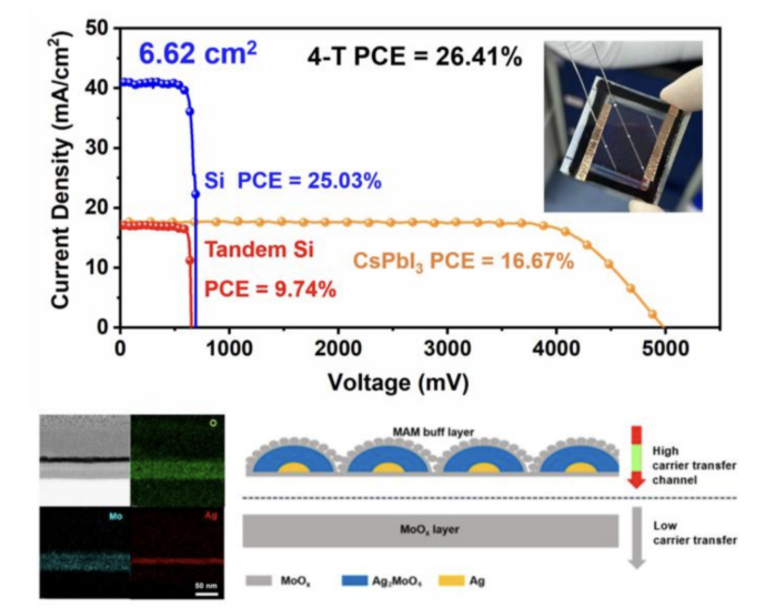 A camada tampão MoOX/Ag/MoOX, desenvolvida pela equipe de pesquisa, forma Ag2MoOX por meio de uma reação interfacial entre uma camada de prata e óxido de molibdênio, melhorando significativamente o transporte de portadores e a eficiência de coleta. Um dispositivo de célula solar de CsPbI3 semitransparente de 0,50 centímetro quadrado, fabricado com essa tecnologia, atingiu uma eficiência de conversão de 18,86%, e a eficiência de uma célula solar tandem CsPbI3/TOPCon de quatro terminais foi ainda mais aprimorada, chegando a 26,55%.