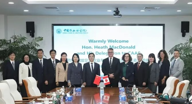 Em 29 de outubro, o presidente da Academia Chinesa de Ciências Agrícolas, Huang Sanwen, recebeu a visita do Ministro da Agricultura e Agroalimentar do Canadá, Marie-Claude Bibeau, e sua comitiva, para trocar opiniões sobre o fortalecimento da cooperação em tecnologia agrícola entre China e Canadá. A reunião contou com a presença de Guo Naying, vice-diretora do Departamento de Cooperação Internacional do Ministério da Agricultura e Assuntos Rurais da China.
