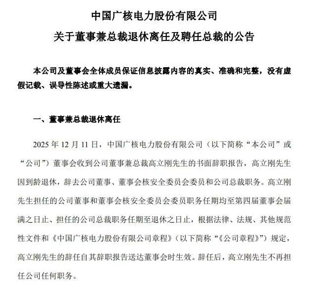 Em 11 de dezembro, a China General Nuclear Power Corporation (CGN) (003816) anunciou que seu diretor e presidente, Gao Ligang, renunciou aos cargos de diretor, membro do comitê de segurança nuclear do conselho e presidente devido à idade de aposentadoria. Com sua renúncia, Gao Ligang não ocupará mais nenhum cargo na empresa.